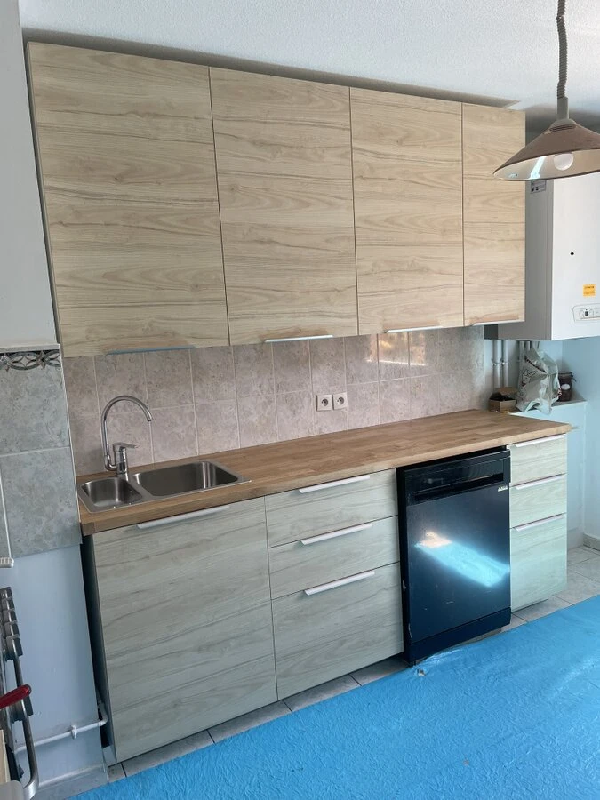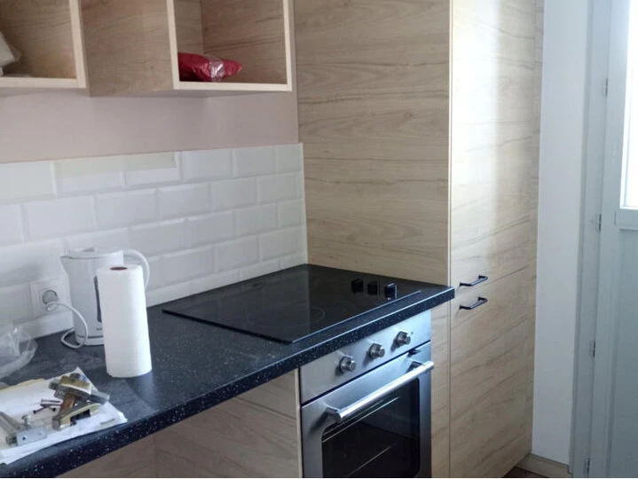7 Pose des meubles, du plan de travail, et des appareils électroménagers (à raccorder au réseau électrique).